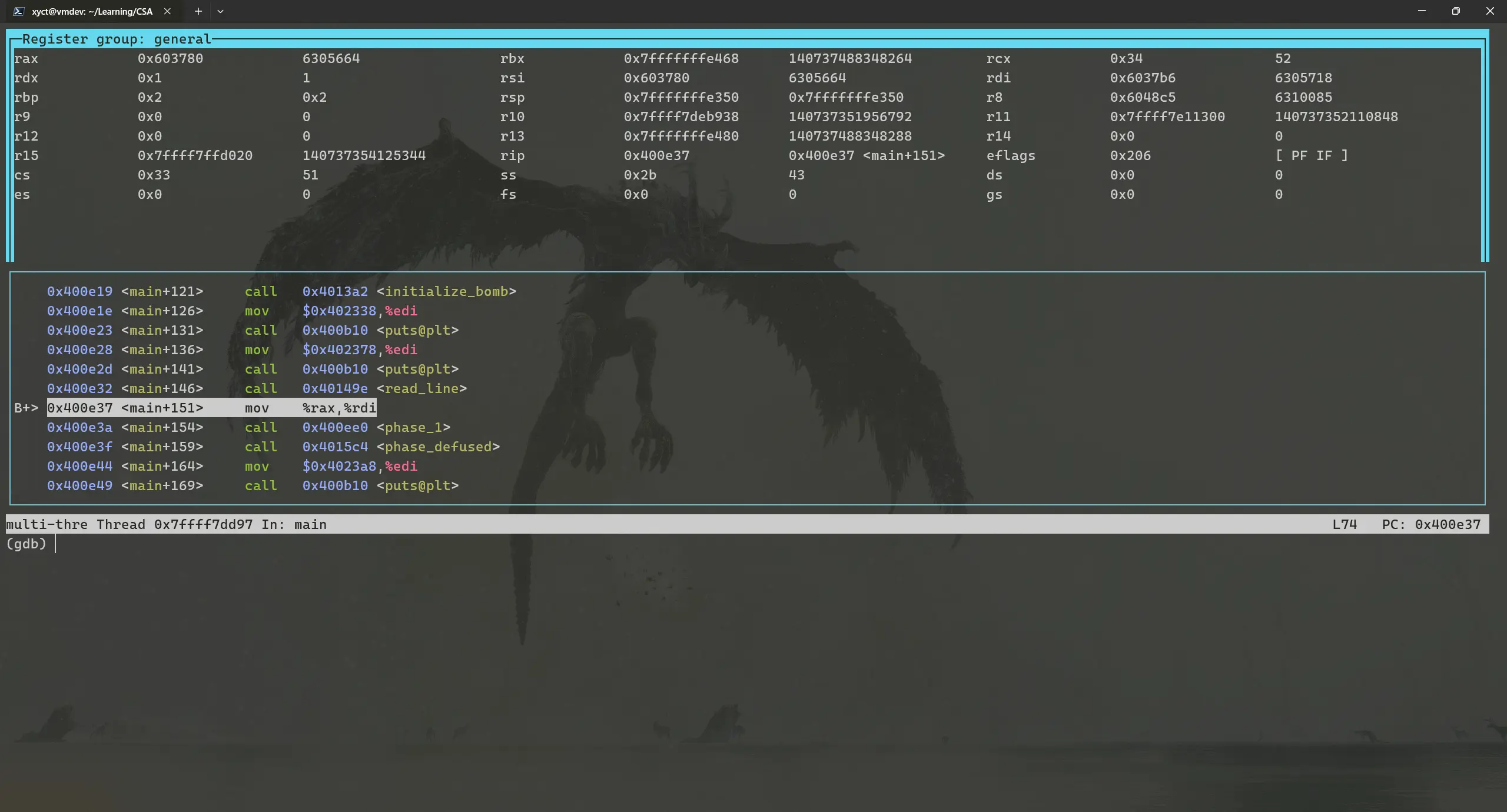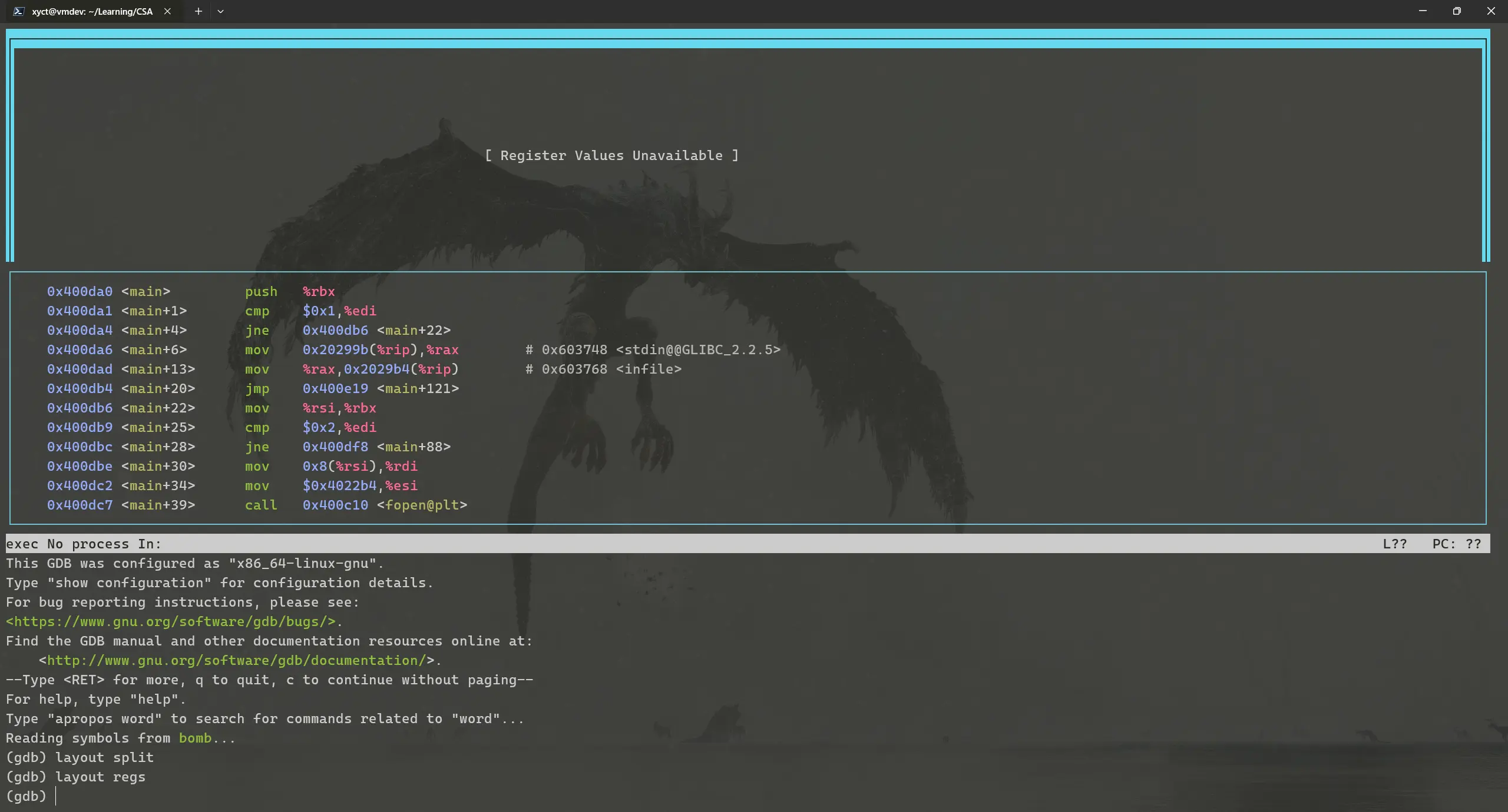 进入bomb和bomb.c所在的目录之后,运行gdb -tui bomb进入GDB Text User Interface界面。敲一下回车然后依次输入layout split和layout regs,此时你的终端应该长这样: