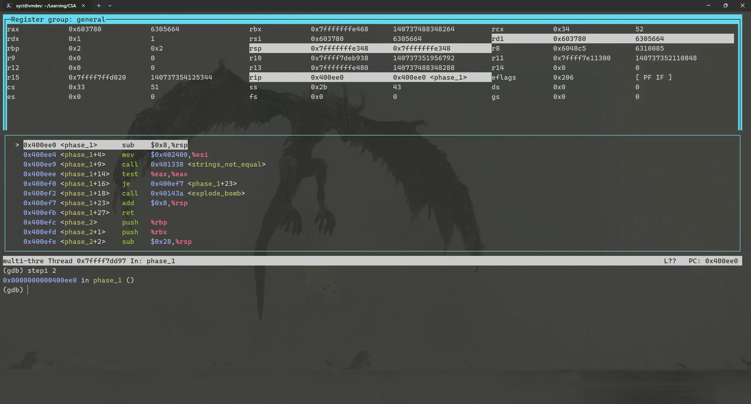 接下来我们输入stepi 2,意思是再执行两条指令,然后停下,这时候我们应该进入函数phase_1内部了: