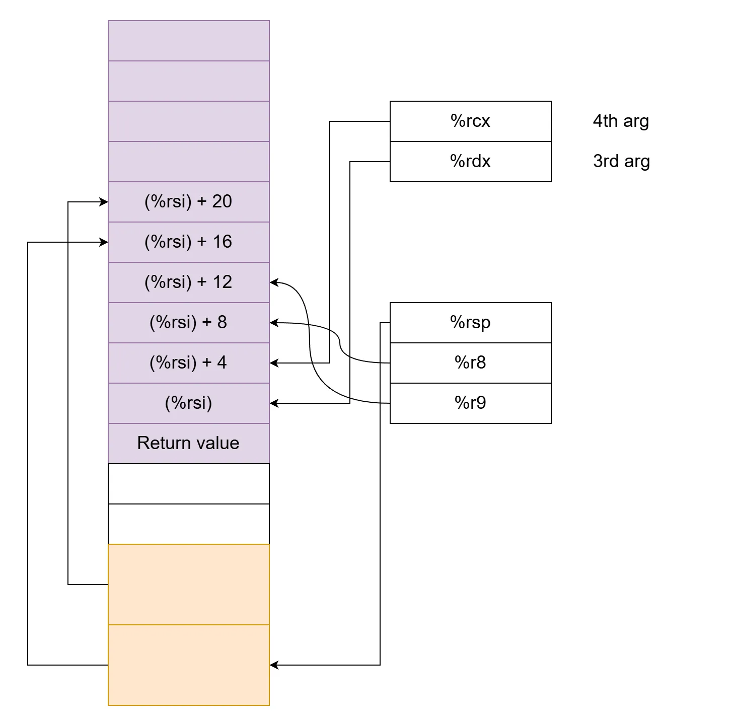 图中紫色的是phase_2的栈帧(注意里面的数字是十进制的),箭头表示这些寄存器和两个橙色的内存块(每个8 Bytes)是作为指针使用的,分别指向这些地方。所以我们之前判断的没错,phase_2栈帧最后的24个字节,是作为6个参数(第3参数到第8参数)传入到sscanf函数(<__isoc99_sscanf@plt>)中保存读取到的6个数字的。