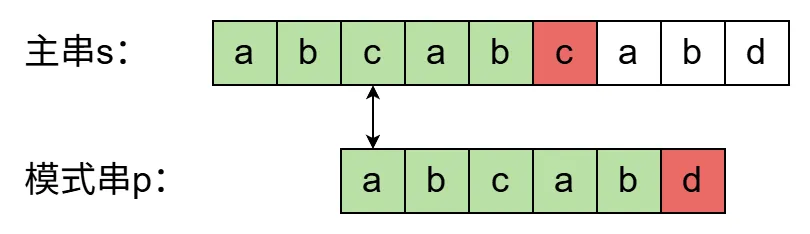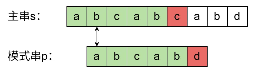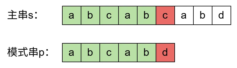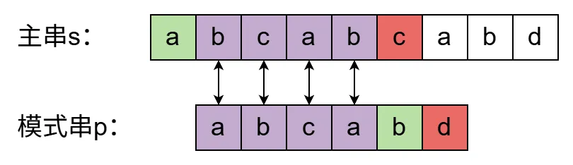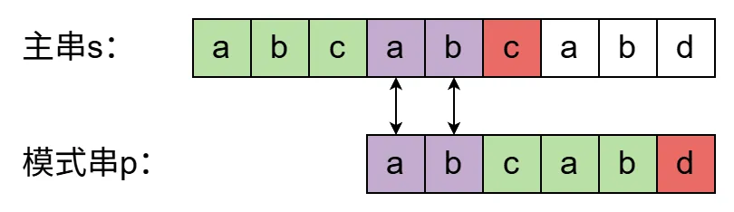 仔细观察一下,主串中紫色的ab是字符串abcab的真后缀,模式串中紫色的ab是字符串abcab的真前缀。