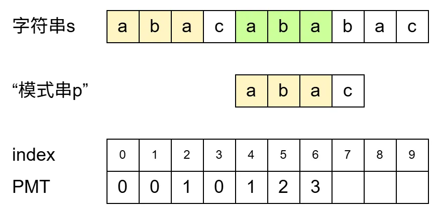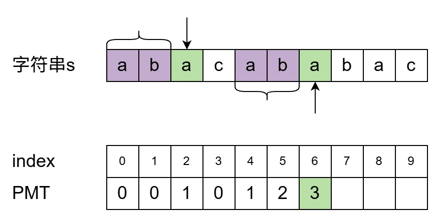 其中PMT(Partial Match Table)表示从字符串开始到当前字符(包含当前字符)形成的子字符串的最长相等真前后缀的长度。例如前三个字符形成的子字符串aba的最长相等真前后缀是1。
